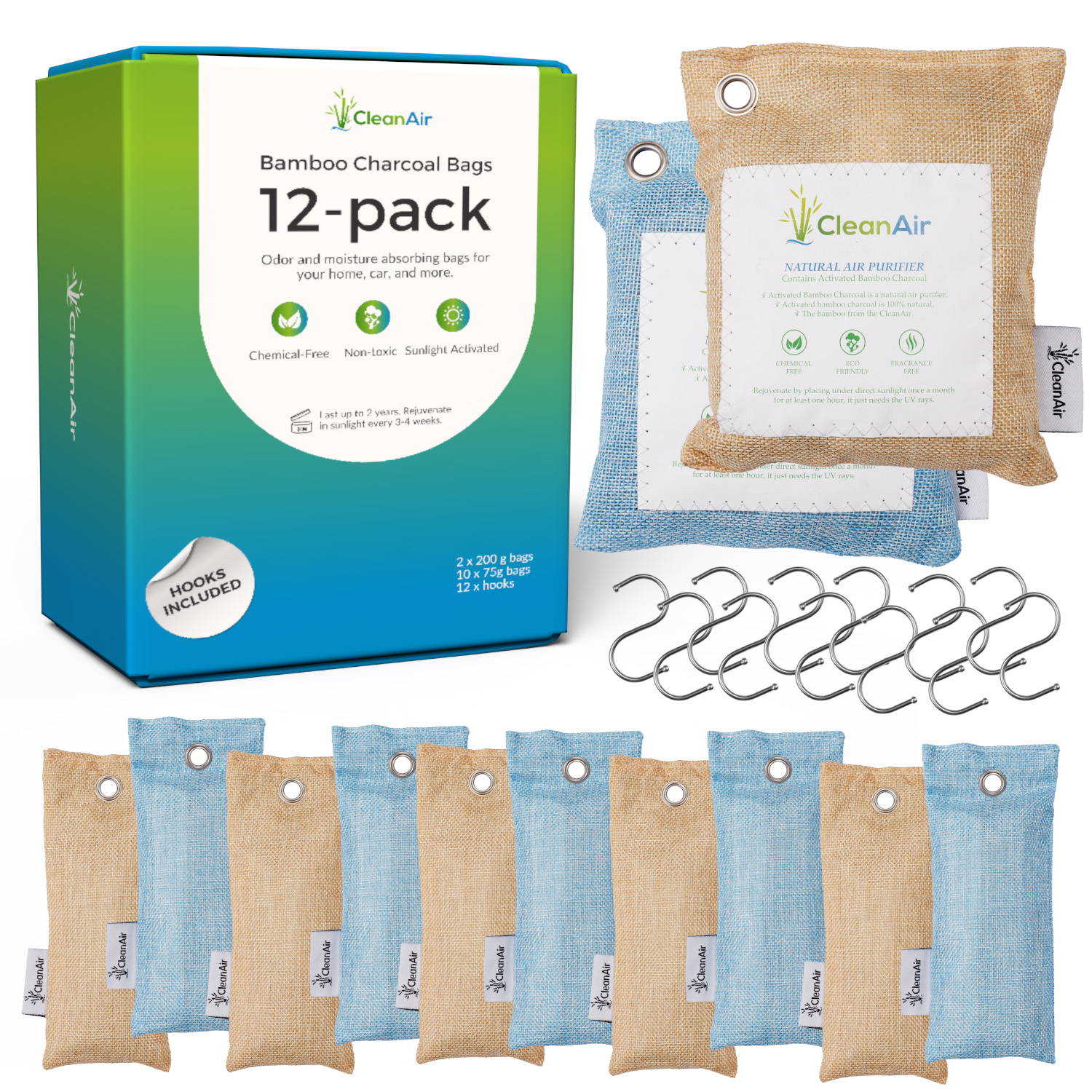 12-Pack of CleanAir Bamboo Charcoal Bags for comprehensive air purification. This generous pack includes two large bags and ten smaller ones, designed for versatility. The large bags, suitable for closets, shoes, gym bags, and more, can be conveniently hung wherever needed. The smaller bags are perfect for shoes and can effectively absorb odors and moisture.